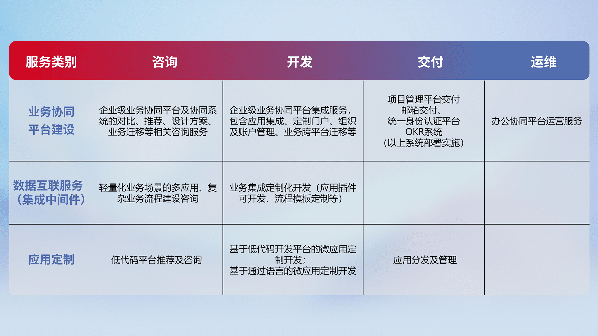 针对钉钉、、、、企微、、、、IDaas等平台级产品提供产品的规划、、、方案、、、、交付、、定制化开发等服务,,,实现如统一协同办公、、、、智能客户服务、、混合会议管理、、、、智能数据查询、、等业务场景,,,,实现数字化转型。。