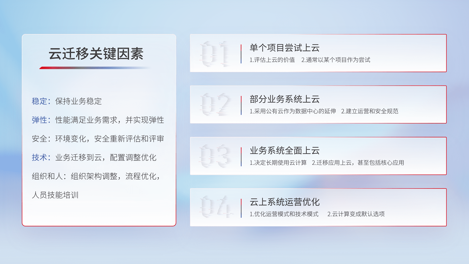 结合实际业务,,,从规划设计、、云平台选型、、云原生改造、、数据迁移、、、、集成交付,,,迁移全过程为客户识别最佳上云路径,,,做好风险识别管理,,,设计网络架构、、身份权限、、、安全审计合规、、、、操作审计、、、日志审计、、、、监控告警策略、、多站点容灾设计等,,,对云上基础设施进行整体规划,,提升IT治理水平,,,,以满足弹性、、高可用、、、、高性能的需求。。。