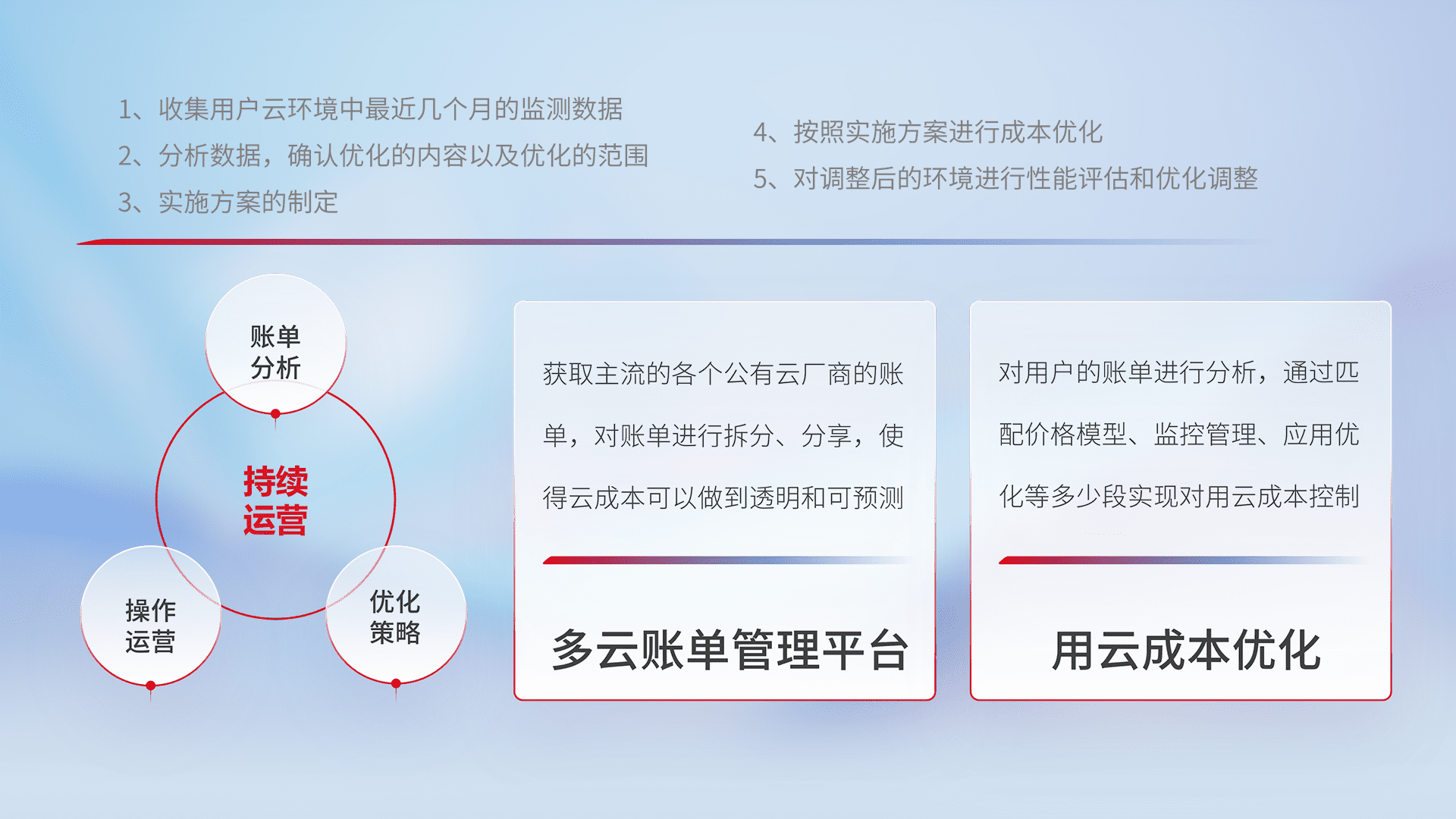 通过灵活运用多种自动化迁移工具,,,帮助企业用户实现业务和数据高效 、、稳定的上云迁移和云上迁移,,,采用自研多云纳管平台,,,,以中立管理模式,,,,解决多组织、、、多云、、、多运维厂商的复杂关系的管理,,,保证多云平台资源配置的一致性,,实时掌控云资源运行数据,,运用智能化工具分析云资源多云平台的管理服务,,,透明化管理成本支出,,用云成本可预测、、用云费用可优化、、、、云资源配额有据可依。。。