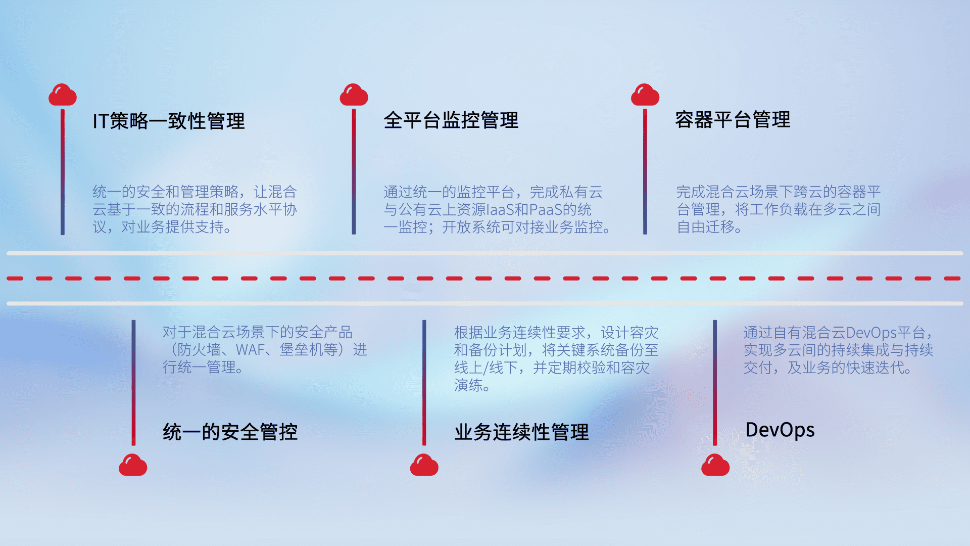 通过多云纳管,,以统一的资源数据模型把客户的云资源进行抽象和封装,,,进而实现对多云资源的统一操作,,,保障云资源管理的可靠性、、稳定性与可用性。。量身定制化运维内容,,,配置、、、开发运维、、补丁管理、、备份、、监控、、、、认证和访问管理、、、、审计和日常巡检等,,,,保障在用云过程中的可靠度,,,,稳定度以及高可用率。。